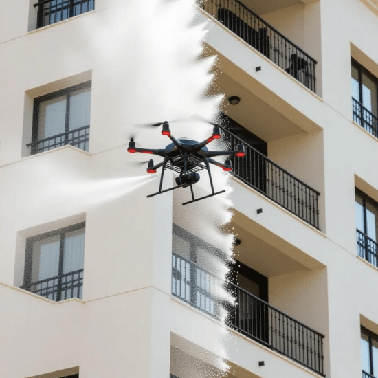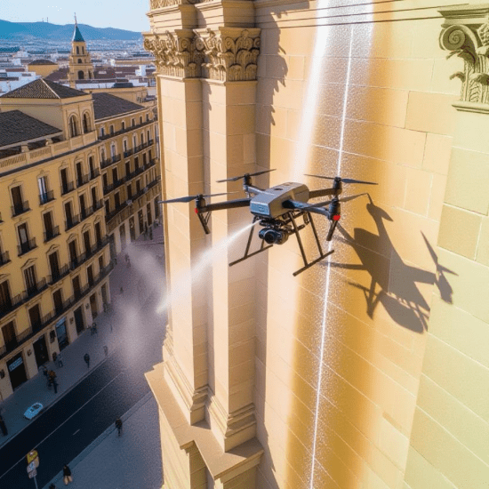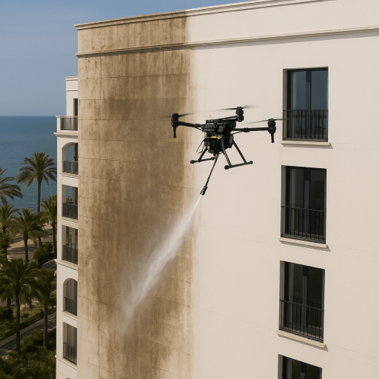 Los drones permiten limpiar fachadas acristaladas, paneles solares, naves industriales, vehículos de gran tamaño, embarcaciones, cartelería en altura y superficies de difícil